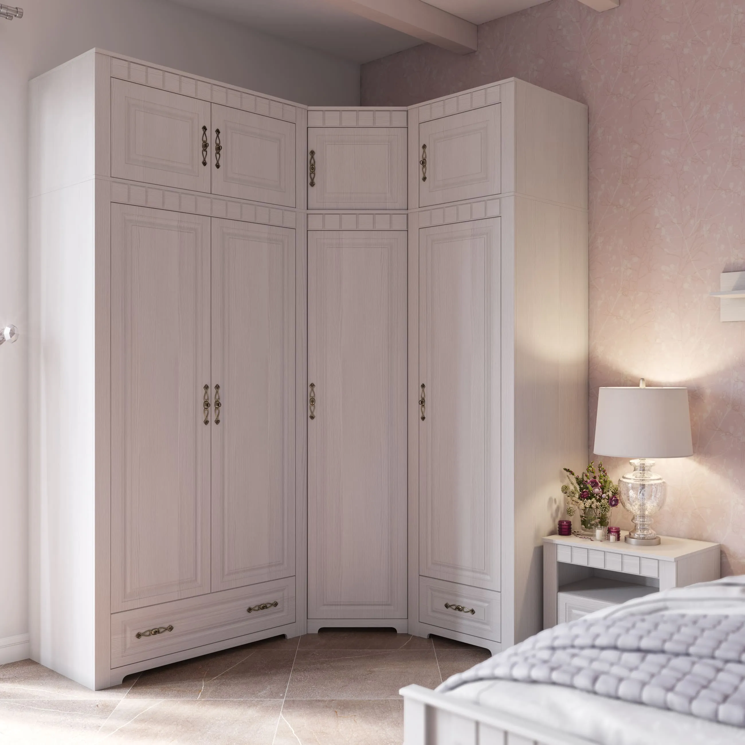 Антресоль угловая - глубина 910 мм, ширина 910 мм, высота 480 мм. За распашной дверью расположена ниша для вещей. Дверь монтируется на любую сторону антресоли. Антресоль ставится на угловой шкаф и крепится к нему межсекционными стяжками.