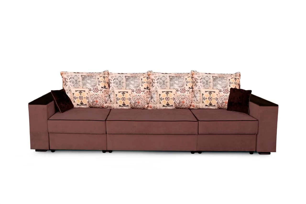 С одной стороны расположена боковина с нишей, с другой – ящики. Надежные петли с доводчиками добавляют комфортности использования мебели. Диван-трансформер может быть прямым, угловым и П-образным. Малые декоративные подушки входят в комплект дивана.