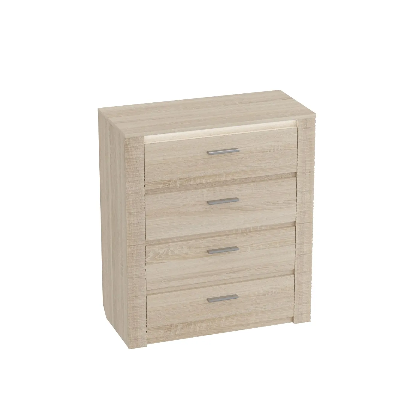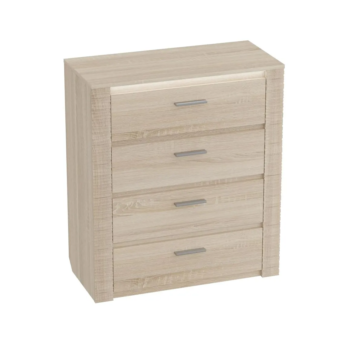 Комод оснащен четырьмя выдвижными ящиками на роликовых направляющих. Под столешницей имеется стеклянная панель (5 мм), предназначенная для установки светильника. Комплект подсветки (светильник и блок питания) приобретается отдельно. Блок питания рассчитан на подключение шести светильников.
