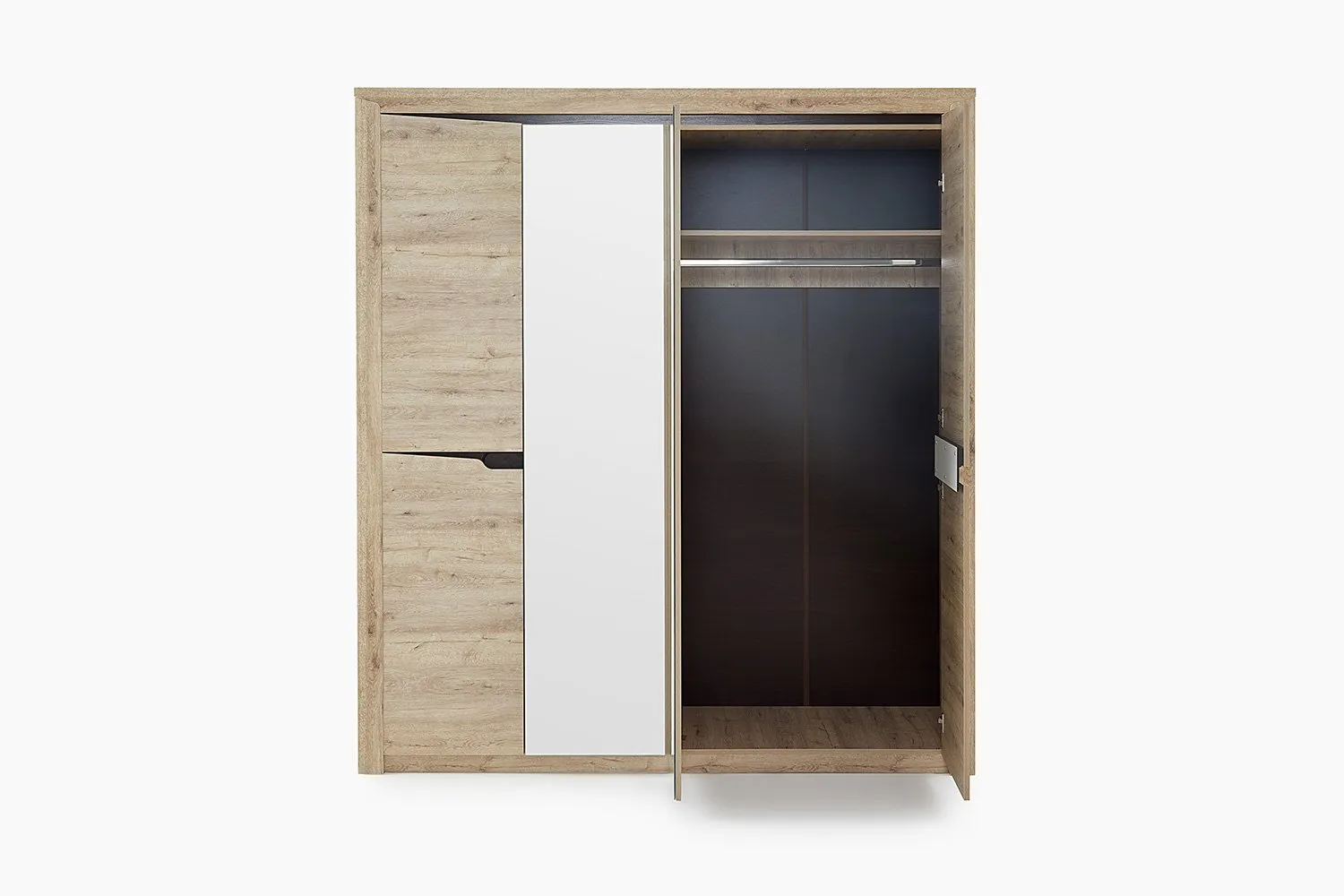 Четырёхдверный шкаф "Соренто" с зеркалом отлично подойдёт для спальни или прихожей и станет прекрасным дополнением к вашему интерьеру. На боковых дверях имеются декоративные вырезы, выполняющие функцию ручек. Одно из отделений шкафа можно изменить комплектом из трёх полок (приобретается отдельно).