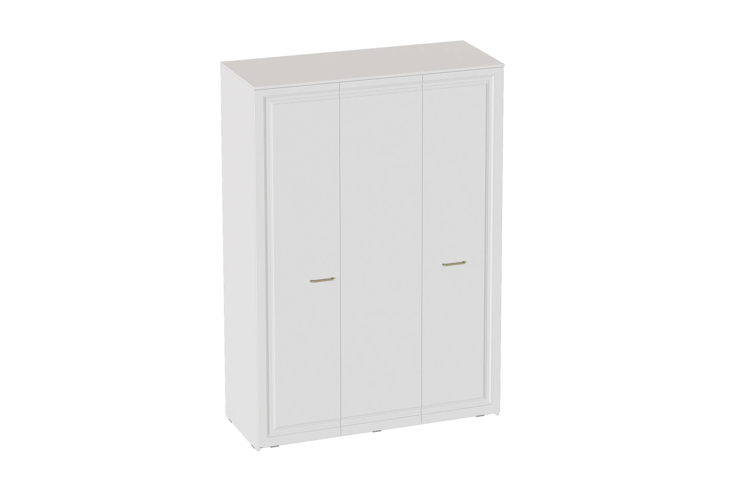 Шкаф выполнен в цвете Айс 06 / Белый Аляска. Классическая фрезеровка фасадов и ручки-скобы из брашированного золота придают изделию особый шарм и элегантность. Внутреннее пространство шкафа разделено на два отделения: слева находится отделение для одежды с одной большой стационарной полкой, одной большой съёмной полкой и продольной металлической штангой; справа находится отделение с одной небольшой стационарной полкой и четырьмя съёмными полками. Двери шкафа оснащены петлями с амортизаторами.