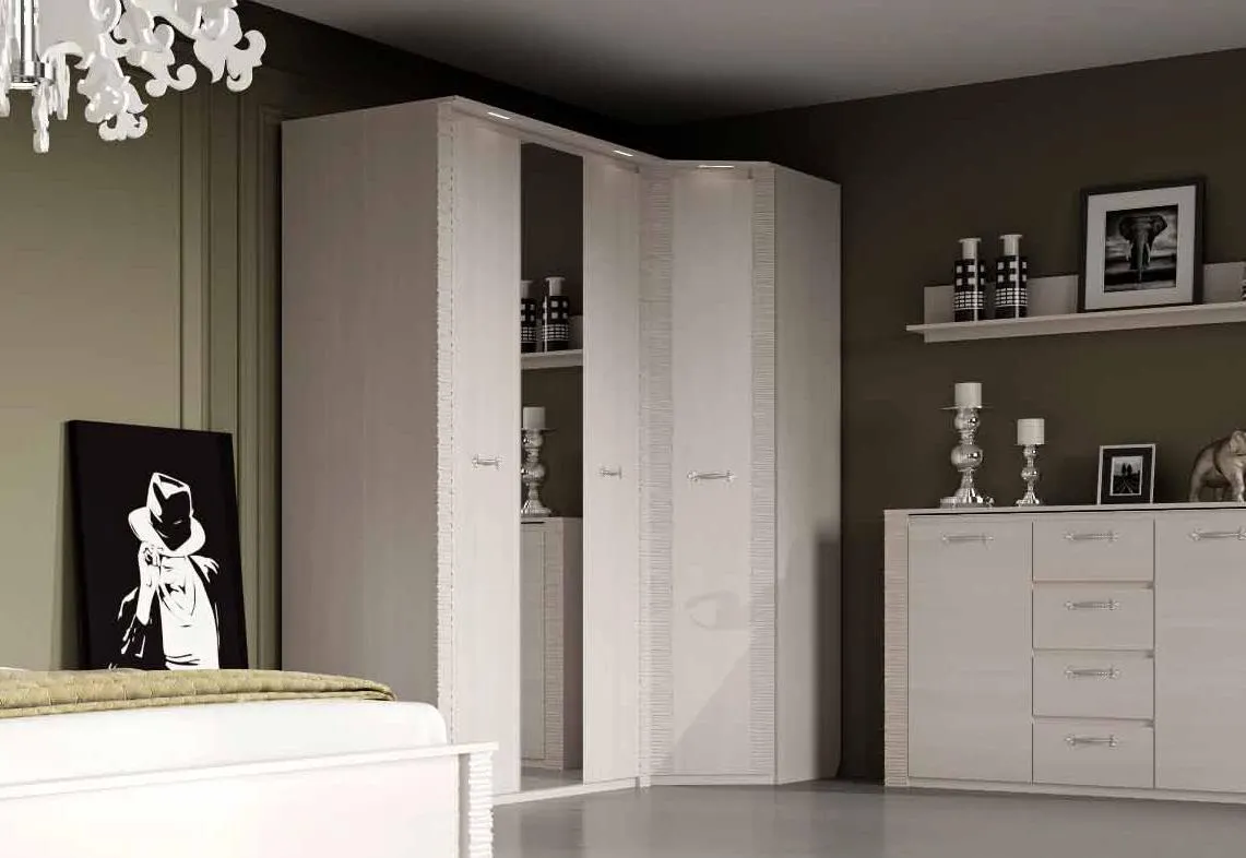 Угловой шкаф оснащен двумя отделениями: для белья с четырьмя жёсткими полками; платяное с жесткой полкой и продольной стальной штангой. В колпаке шкафа имеется паз для светильника, входящего в комплект. Блок питания приобретается отдельно, и рассчитан на подключение шести светильников.
