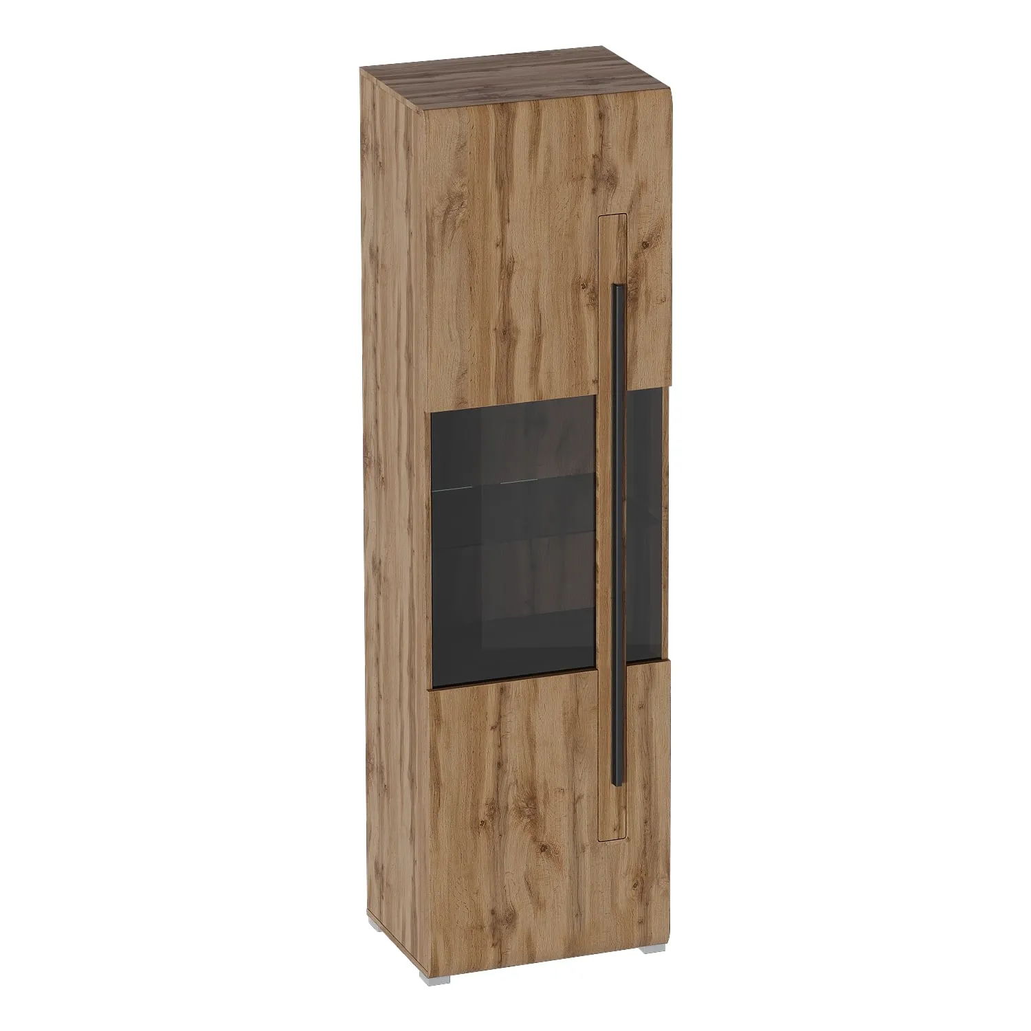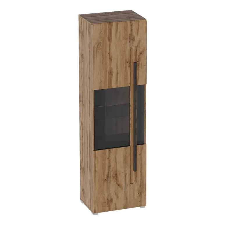 Внутреннее пространство шкафа разделено на три отсека, закрываемые одной общей дверью с затемненным стеклом. В верхнем и нижнем отделении расположено по одной стационарной полке. В среднем отделении расположена стеклянная съемная полка.