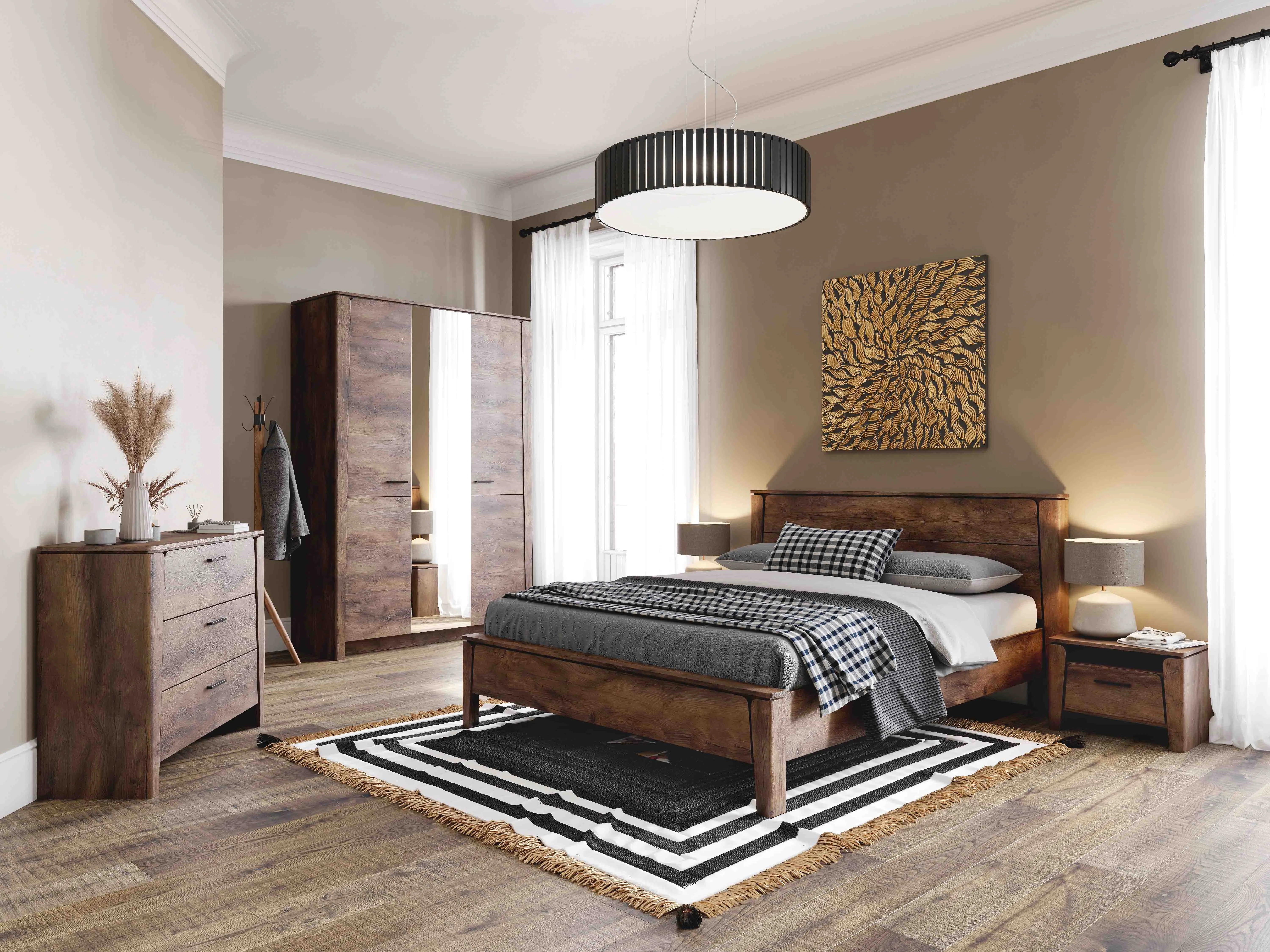 В состав гарнитура входят различные элементы, которые позволят вам создать уютную спальню, такие как: шкаф двухдверный, шкаф трёхдверный, туалетный столик, комод с тремя ящиками, тумба с ящиком, кровать.