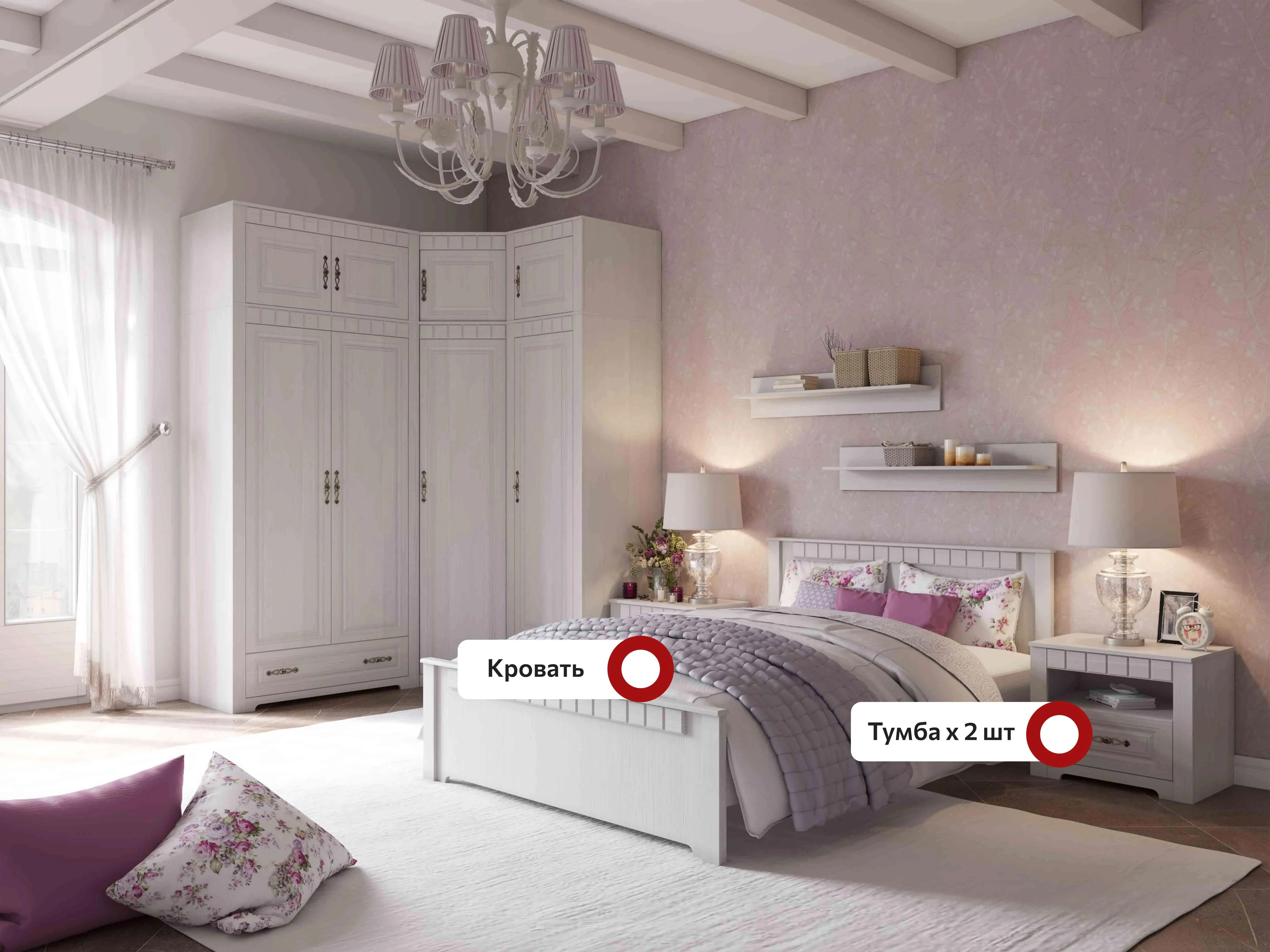 В серию "Прованс" входят: шкаф угловой, шкаф однодверный платяной, шкаф двухдверный, комод, антресоль двухдверная, антресоль угловая, антресоль однодверная, зеркало, стол туалетный, кровать, тумба прикроватная.