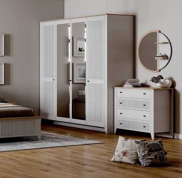 Спальня в цветовом решении "Персидский жемчуг/ Дуб натуральный светлый" придаст интерьеру воздушность, ощущение нежности и легкости, наполнив спальную комнату светом.