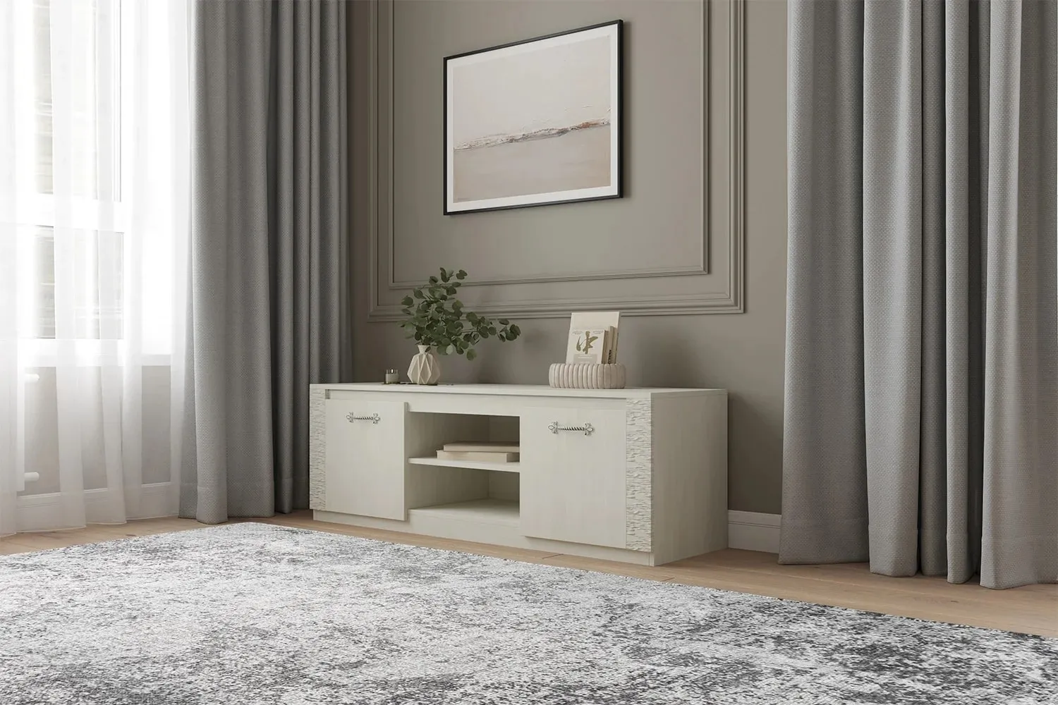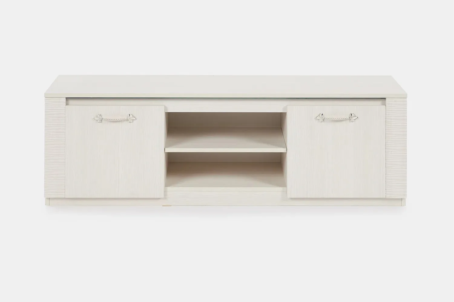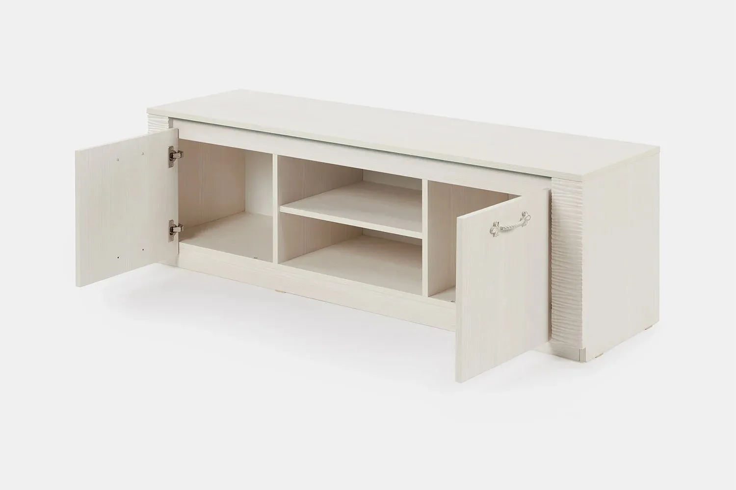 Тумба по ТВ имеет две ниши, закрытые дверцами и центральная открытая с одной съёмной полкой. Под крышкой установлена стеклянная панель для крепления светильников "HLT Prismatic FT".