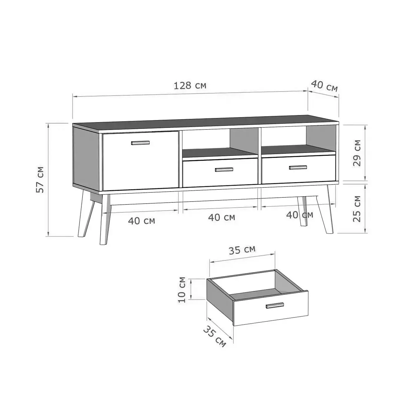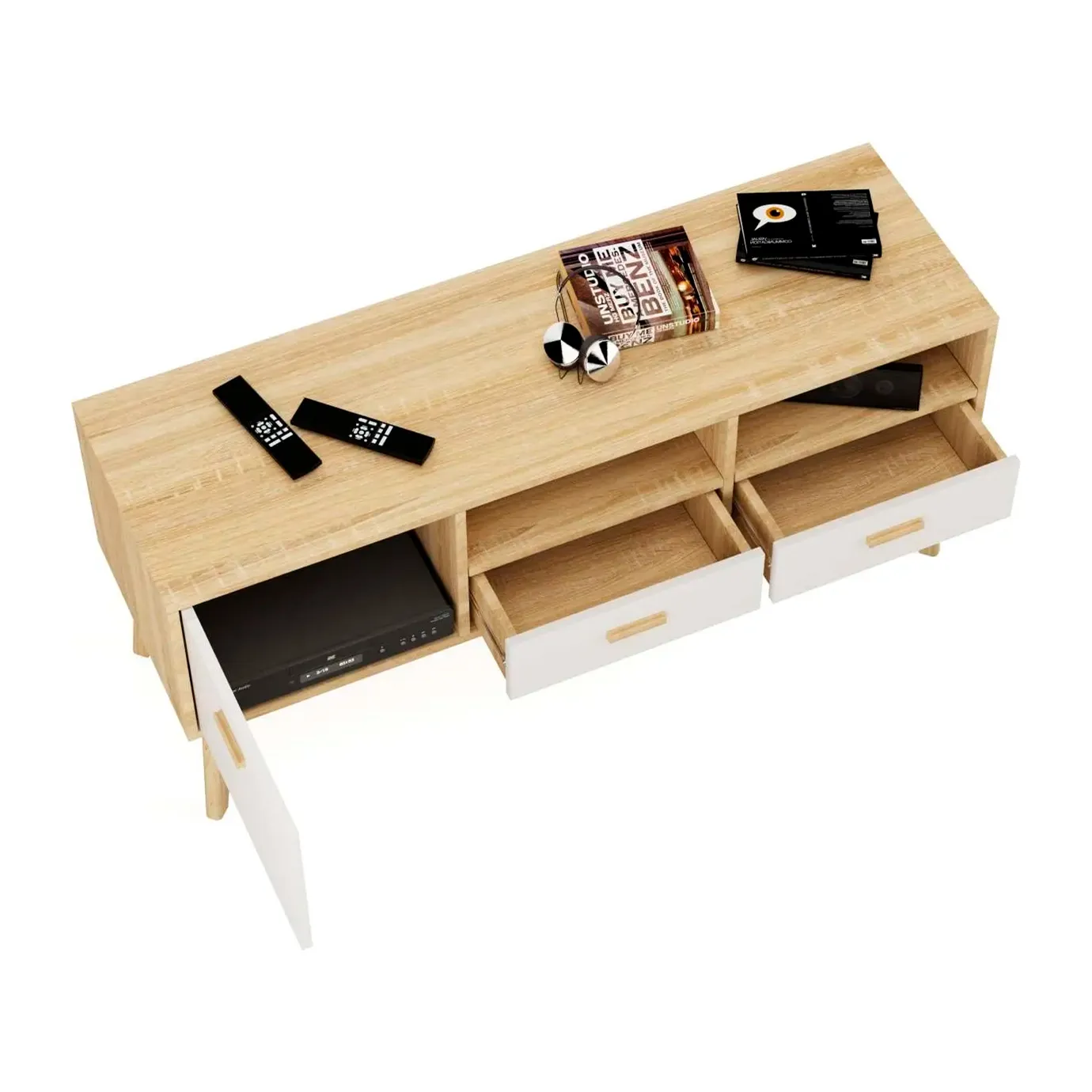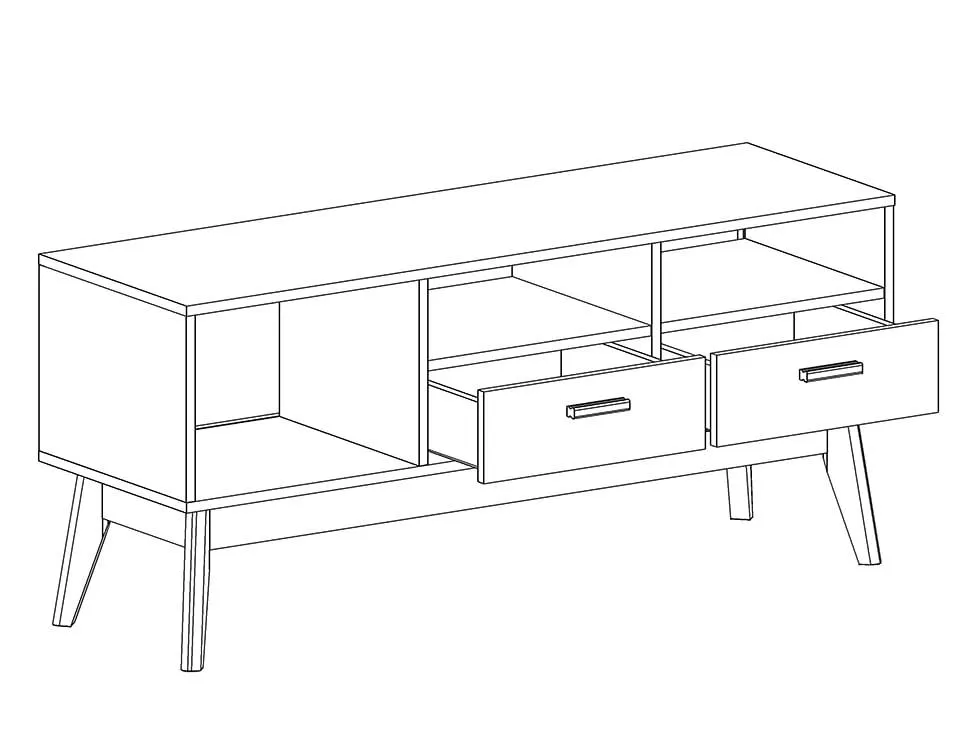 Упорядочить хранение сопутствующих аксессуаров и компонентов домашнего кинотеатра помогут выдвижные ящики с фасадами из белоснежного МДФ, секция с распашной дверцей и открытые ниши. Корпус изделия выполнен из ЛДСП, высокие стильные опоры и ручки - из массива березы.